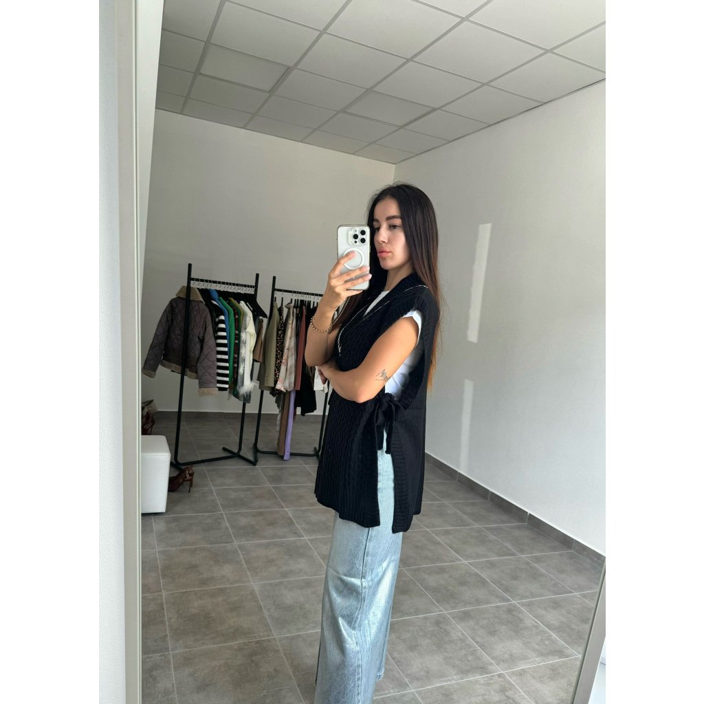 Čierna pletená vesta má štýlové viazanie na bokoch. Je pohodlná a univerzálna na každodenné nosenie. Skvele sa kombinuje s rôznymi outfitmi.